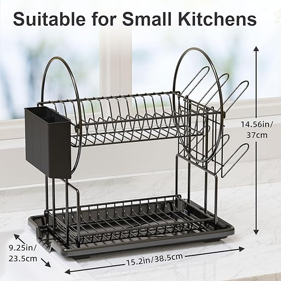 2 Tier Black Dish Drainer Rack with Drip Tray, Stainless Steel Draining Dish Rack drainer with Draining Board and Utensils Holder, Dish Drying Rack Kitchen Drainer for Small Kitchen Countertop