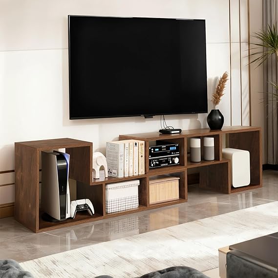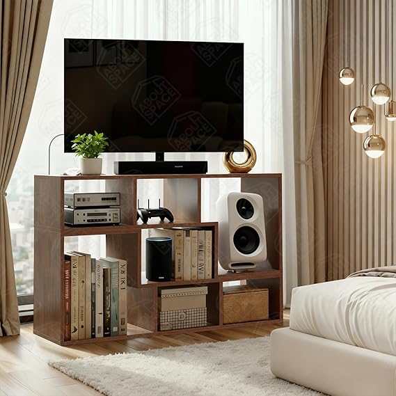 • Modern Contemporary Design: This TV showcase for the hall is built up of engineered wood with a modern contemporary minimalist design. It comes pre-laminated with a matte finish that is durable and long-lasting. It has 6 compartments for storage and display. It can store router, set top box, CD, Xbox, VCR, stereo , etc.