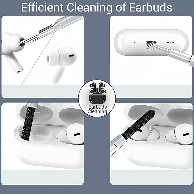 • Headphones Cleaning Pen: Cleaning pen with a metal tip can deeply clean stubborn dirt, mini brush cleans the earphone mesh; round brush and soft brush can clean the dust and dirt hidden in the deep of the charging case. There is an extended handle for these accessories, making them easier to use.
