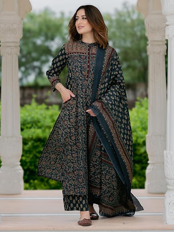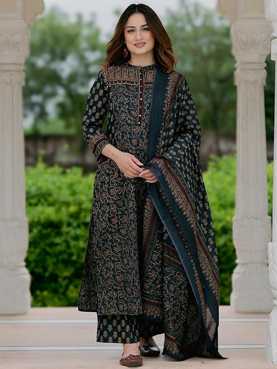 • Complete Three-Piece Set: Includes a printed straight kurta, coordinated palazzo pants, and a beautifully patterned dupatta.