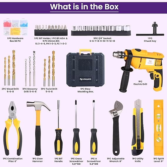 Asian Paints Corded Electric Professional Impact Drill Tool Kit,550 Watts,2900 RPM,Chuck 10Mm Machine Variable Speed,Forward/Reverse Rotation,Double Insulation,Improved Carbon Brush (100 Pcs),Yellow