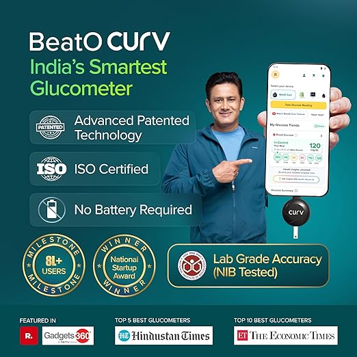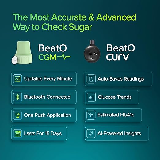 BeatO Combo: CURV Glucometer Machine (Type-C) + 15-Day CGM Continuous Glucose Monitor | Smart Sugar Test Machine for Home | Real-Time Blood Sugar Monitoring Device with Strips | Best Glucometer for Accurate Results