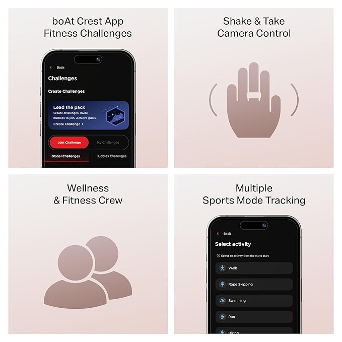 • 30 Days Battery Life with Case| 5ATM Dust, Sweat & Sweat Resistant| boAt Crest app fitness challenges| Multiple Sports Mode Tracking| Camera Control – Shake & Take