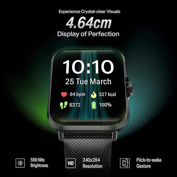 • 1.83” (4.64 cm) HD Display: Get messages, social media notifications, and more on the 1.83” HD display of the boAt Storm Infinity Smartwatch. The 240X284 resolution ensures crystal-clear clarity to check time, notifications, and stats even in the daytime.