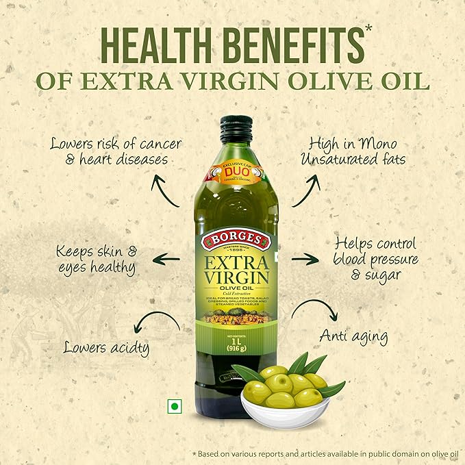 Borges Extra Virgin Olive Oil - 1L Glass |Unrefined Cold Pressed Oil Packed in Spain |75% MUFA | Rich in Antioxidants | Ideal For low heat cooking like sauteing grilling, salad dressing