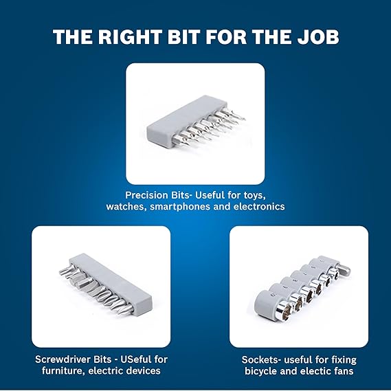 • Multiple Drill Bits: The BOSCH toolkit features 8 precision bits designed for careful tasks such as putting together or taking apart eyeglasses, toys, watches, and smartphones. Screwdriver bits intended for assembling furniture, electrical equipment, and toys. Sockets useful for repairing bicycles, electric fans, or hex screws. Masonry drill bits, dowel plugs, and screws for a range of household and professional uses.