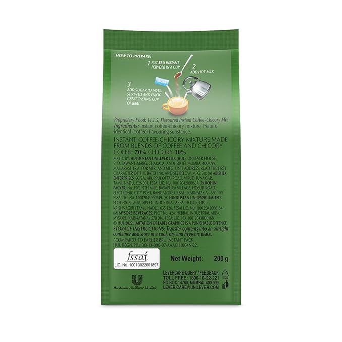 • Instantly Made : Add one teaspoon of Bru Instant in a cup along with hot milk and/or water, sugar to taste and your Bru is ready to drink!