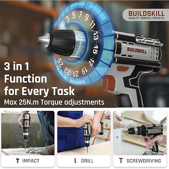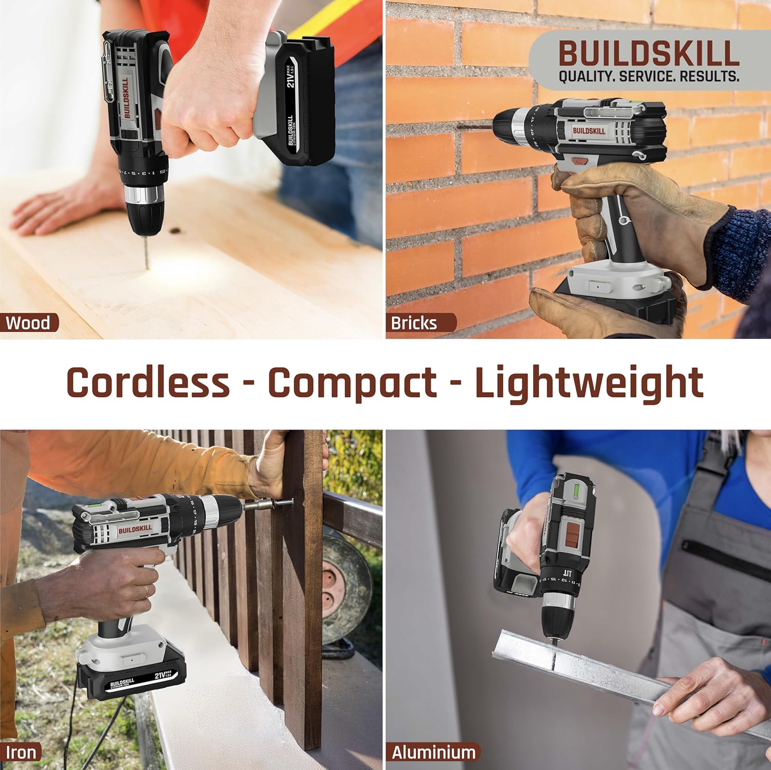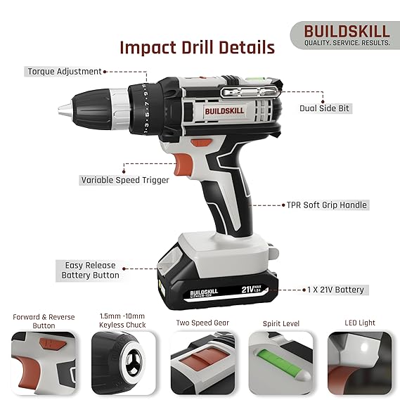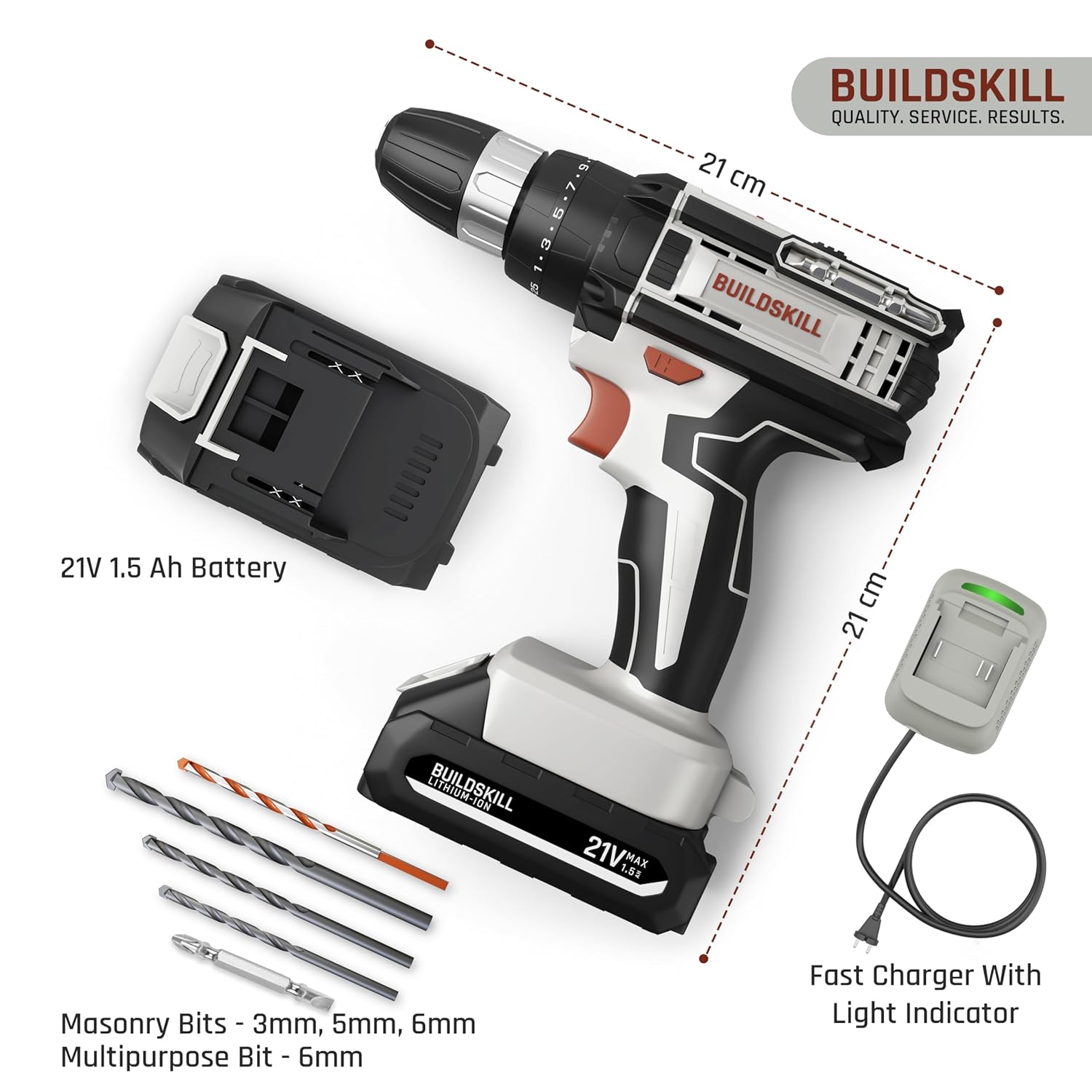 BUILDSKILL 21V Cordless Drill Machine for Home Use | Impact Drill with 10MM Keyless Chuck | 1.5 Ah Single Battery | Charger | Variable Speed | LED Light | Forward & Reverse Motion