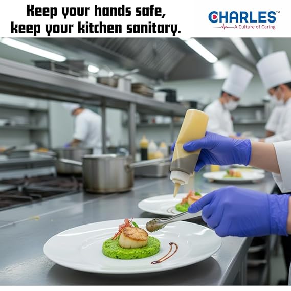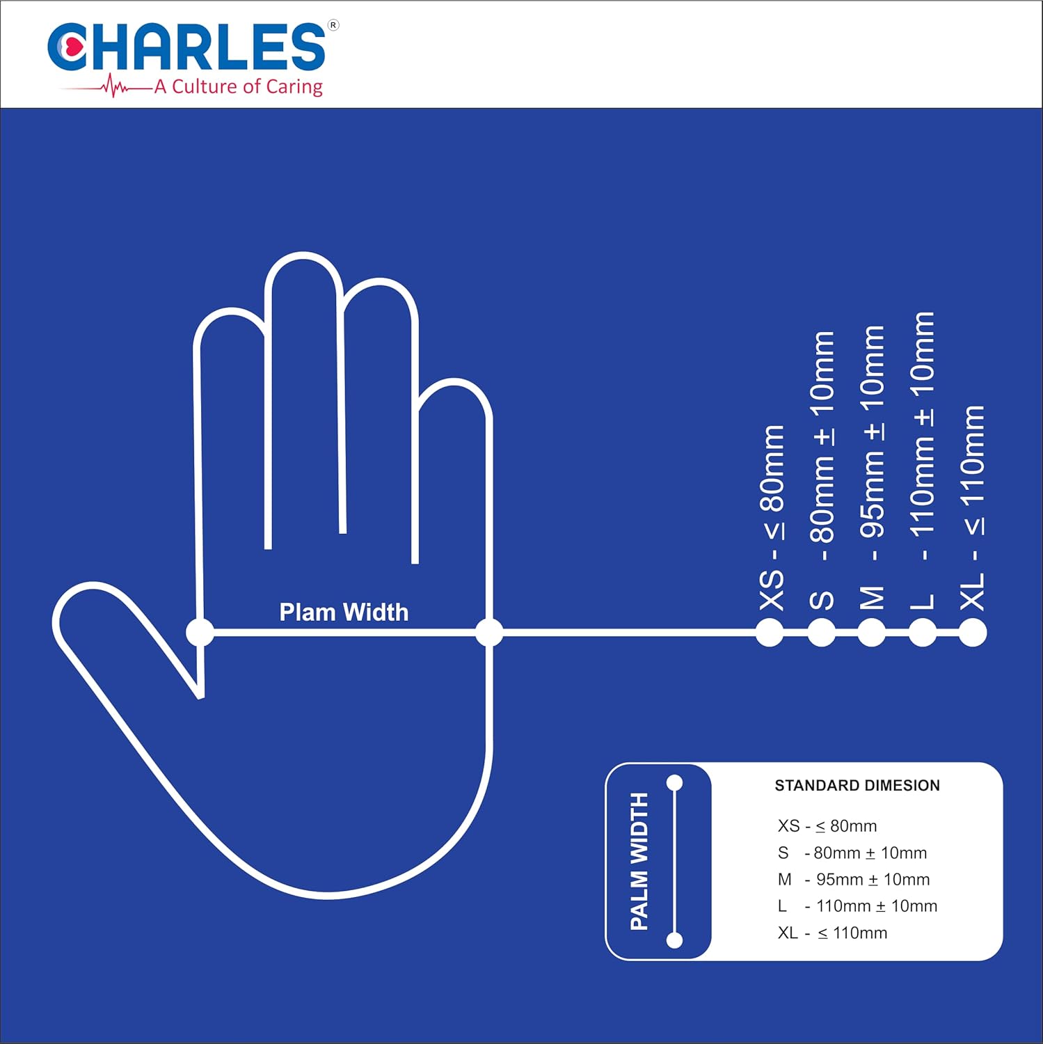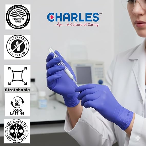 CHARLES (Box of 100pcs) Nitrile Examination Hand Gloves | Medium Size | Powder Free | Blue | CE Approved | Multipurpose with Good Fit & Comfort | Made in Malaysia