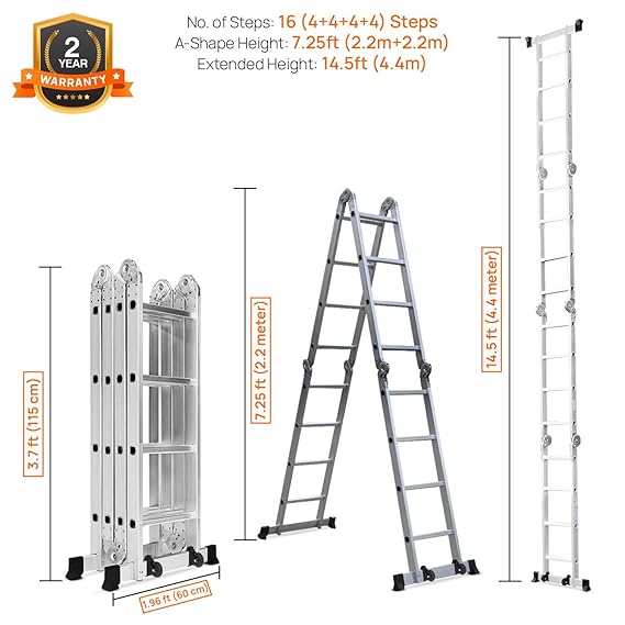 • Product Dimensions: The ladder extends up to 14.5 ft, and in its A-step configuration, it reaches 7.25 ft. When folded, its size is 118 x 35 x 26 cm. It has 16 steps (4 sections with 4 steps each), weighing 12.8 kg, with a load capacity of 120 kg. This multipurpose ladder is perfect for both indoor and outdoor use.