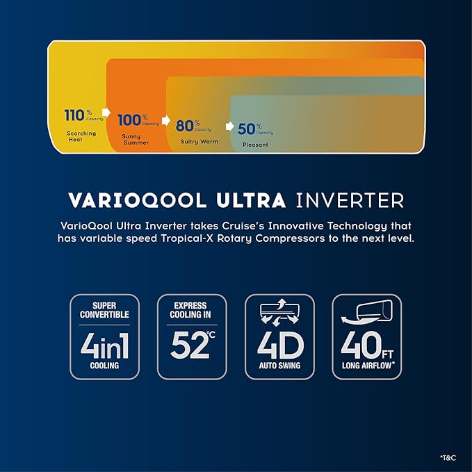 • Split AC with inverter compressor: Variable tonnage technology for faster cooling that adjusts power depending on cooling requirement. With VarioQool Convertible 4-in-1, you get flexibility to increase or decrease cooling capacity as per requirements.