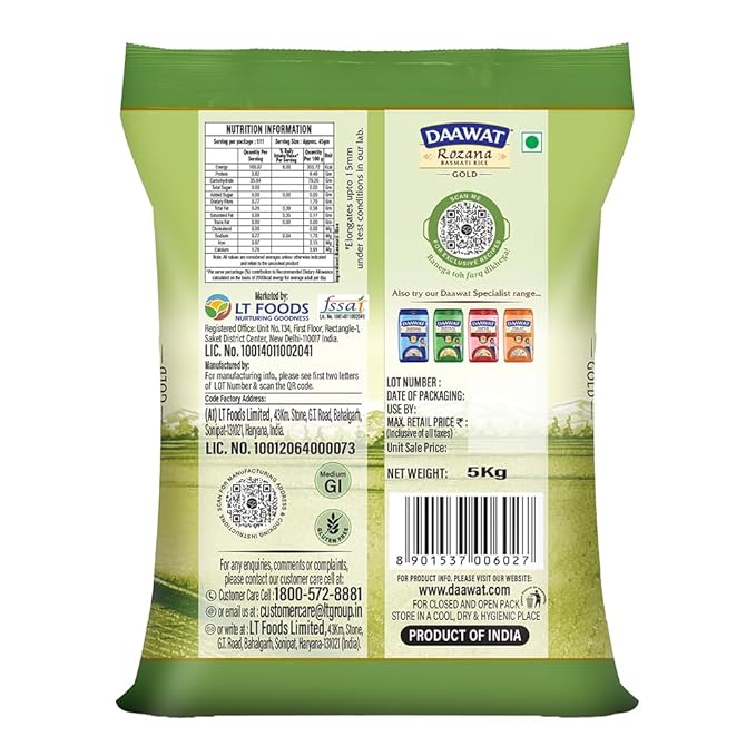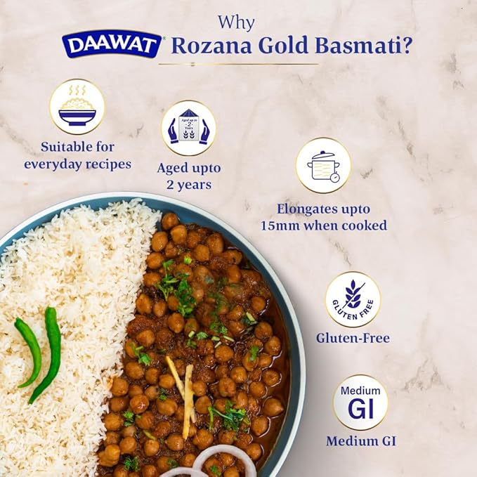 • NATURALLY AGED BASMATI: Discover the excellence of Daawat Rozana Gold Basmati Rice, aged to perfection to ensure a delightful aroma, superior taste, and long grains that cook up fluffy.