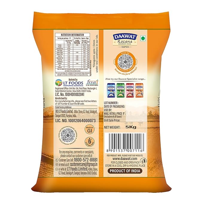 • PREMIUM AGED BASMATI: Delight in the premium quality of Daawat Rozana Super Basmati Rice, aged to perfection to ensure a rich aroma, superior taste, and elongated grains.