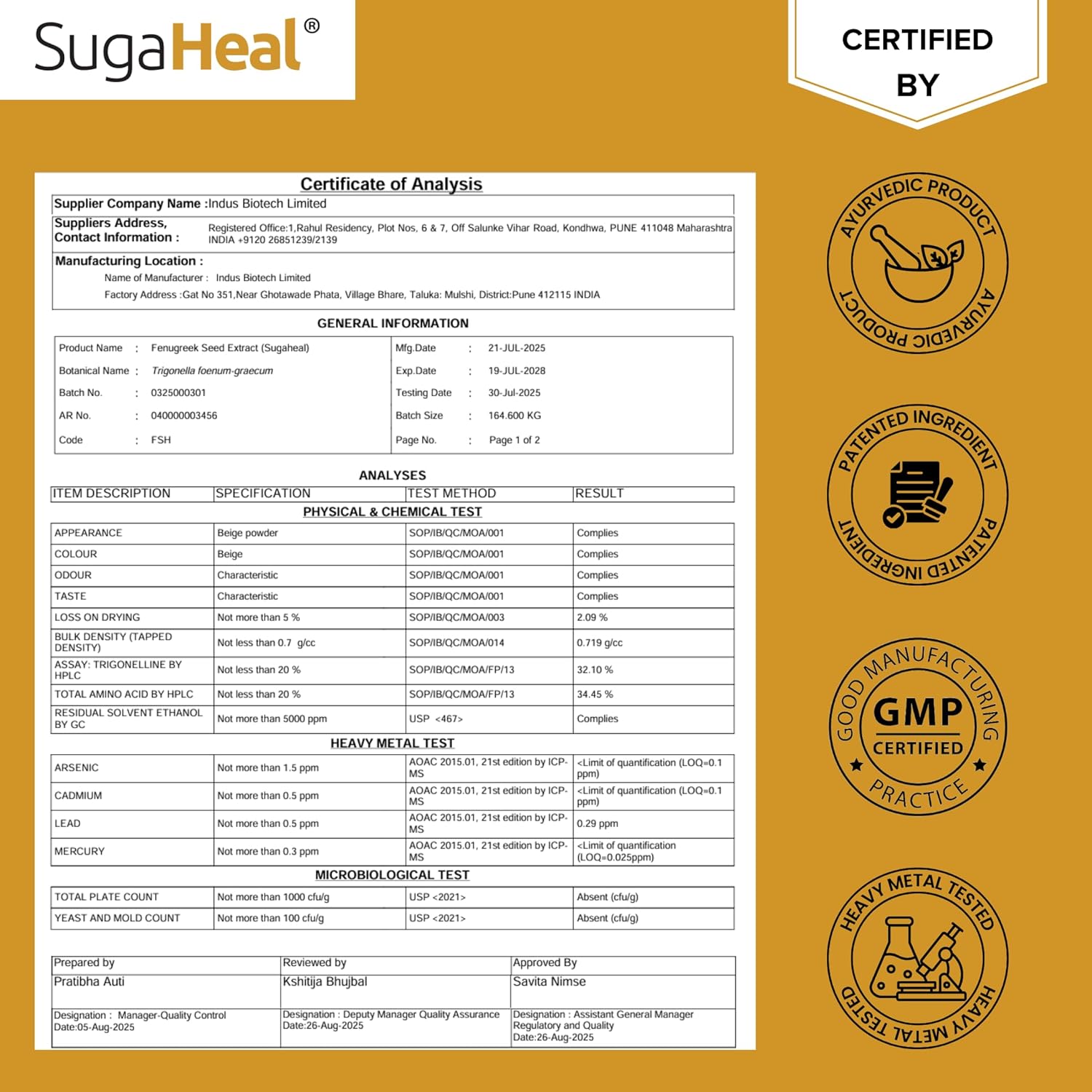 • PATENTED INGREDIENT - The Principle ingredient in the SugaHeal contains Patented Fenugreek Extract Powder which is Standardised to Amino Acids such as 4 Hydroxyisoluecine, Alkaloids such as Trigonelline and Soluble fibers@.