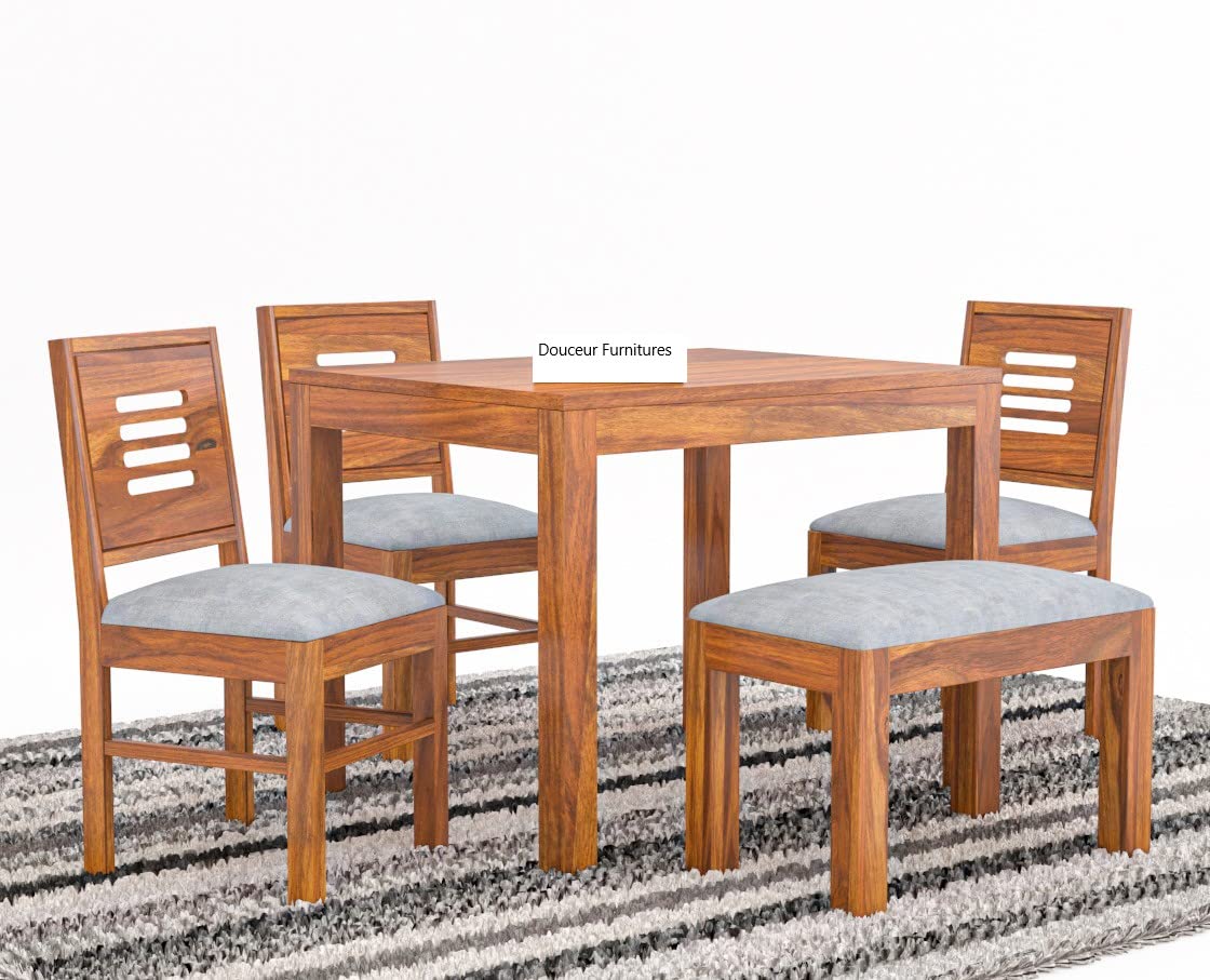 Douceur Furnitures Solid Sheesham Wood 3 Chair with 1 Bench Dining Table Set with Cushioned Chairs for Dining Room | Living Room | Home & Office | Hotels Finish -NaturalTeak