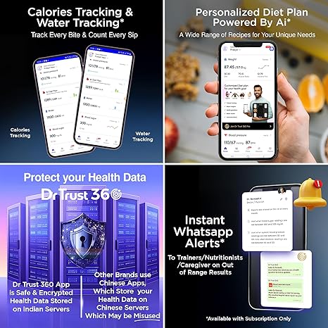 • DETAILED TRACKING WITH DR TRUST 360 APP: Eliminate paper trails! This digital body fat percentage machine seamlessly connects with the Dr Trust 360 app via Bluetooth 4.0, offering comprehensive body analysis and unlimited memory storage. The Dr Trust 360 app provides detailed charts and saves historical data, allowing you to track changes in your body composition over days, weeks, months, or even years. Moreover, our fat analysis machine provides precise analysis of health and body weight for e