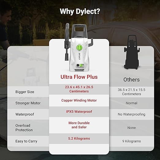 • Power-Packed Performance: Dylect Ultra Flow Plus Car High Pressure Washers are designed for exceptional performance, featuring a sturdy 1900 Watts and 12 Blade Copper Winding Motor providing a water pressure of 140 Bars to remove dirt, grime, and stains.