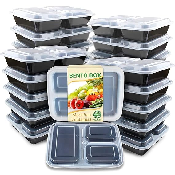 Enther Plastic Bpa-Free Stackable Reusable Portion Control Food Storage 3 Compartment With Lids Bento Box, Black (36 Oz) - 20 Pack, 36 ounce