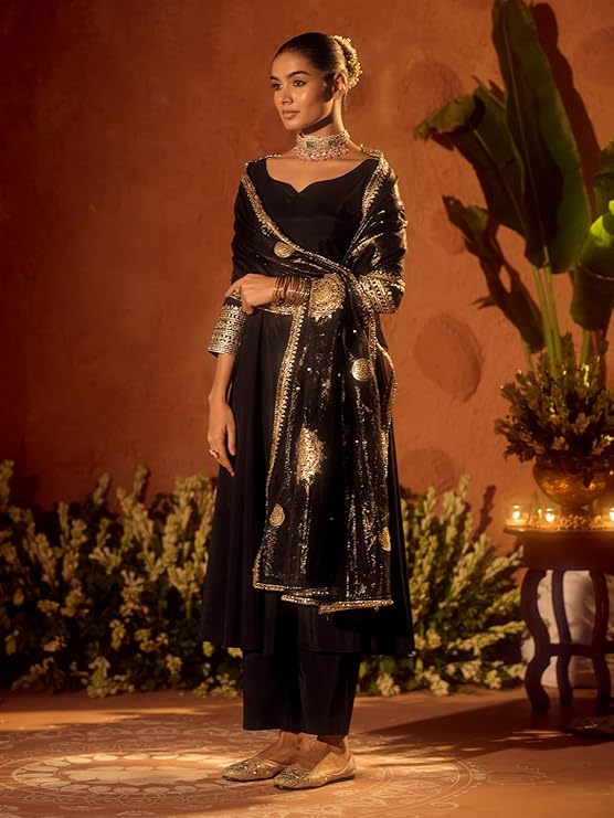 FIORRA Women’s Black Viscose Chanderi Embroidered Ethnic Anarkali Kurta Set with Dupatta