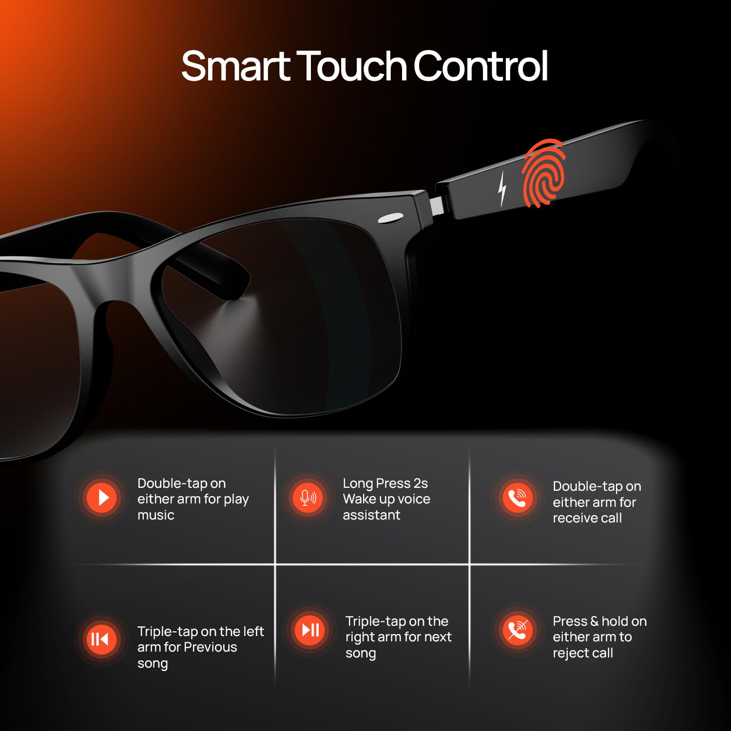 • Fast Charging + Long Battery Backup - Just 15 minutes of charge = 4 hours of use. Enjoy up to 6 hours playtime and 72 hours standby thanks to dual 60mAh batteries. Quick-charge technology ensures your smart glasses are always ready when you are.