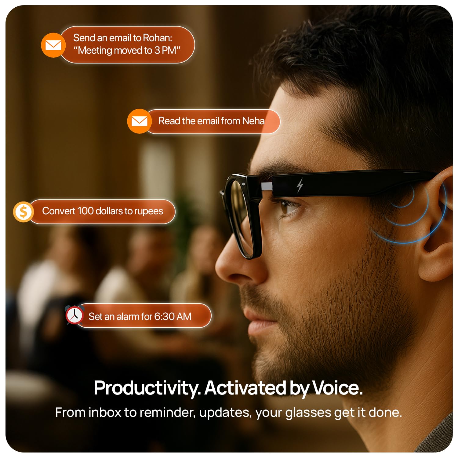 • Smart Touch Controls for Music & Calls - Control your experience with responsive temple taps play/pause songs, switch tracks, or manage calls instantly. Enjoy intuitive navigation without touching your phone. Designed to keep your focus on work, workouts, or travel while staying connected.