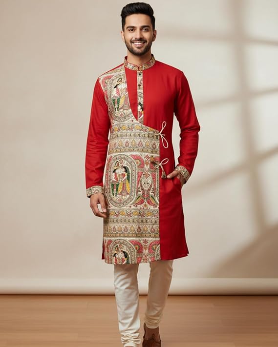 • TRADITIONAL DESIGN: Men's kurta featuring authentic Madhubani art panel with intricate printed motifs depicting traditional Indian folk art in vibrant colour fabric