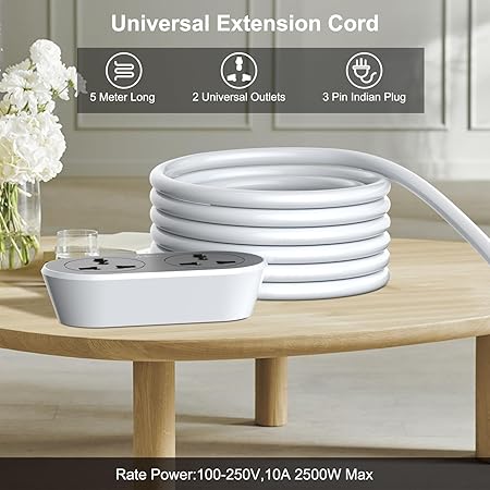 • 【2500w Extension Cord】-- Male to female expandable electric extension wire with a sturdy long-lasting construction. 5 meters in length, two universal outlet extension cord allows you connect two devices at the same time. Power rate:10 amps, 2500 watts, 100-250 volts.