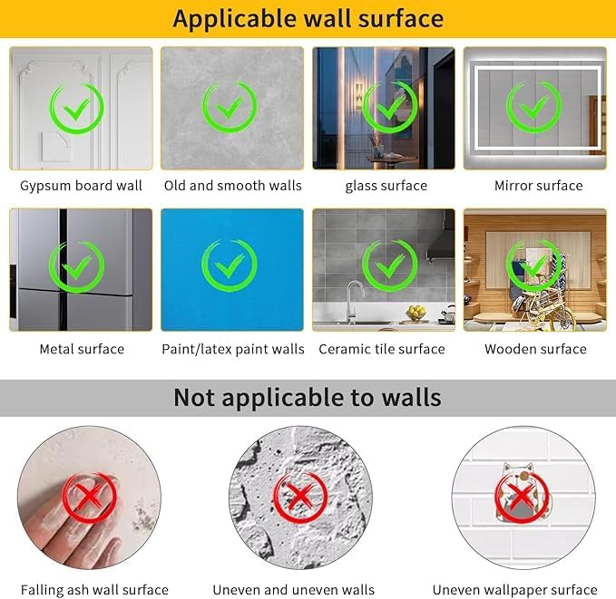 • USE REQUIREMENT: Make sure the wall is smooth and flat before you tile it. For example, ceramic surface, glass surface, flat solid wood panel surface, etc. Not suitable for rough, uneven surfaces