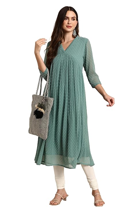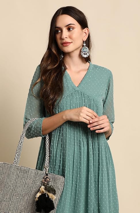 • Style:- Length: 46(inch) | Pattern: Self Design | Occasion: Casual | Type: Flared | Sleeve Type: 3/4 Sleeve(Regular Sleeves) | Color: Green
