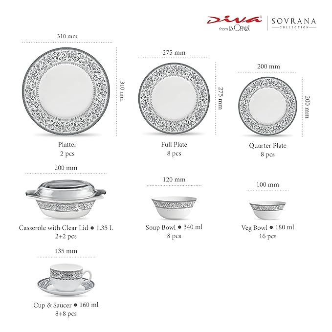 • Package Contents: 8N Full Plate (275 mm), 8N Quarter Plate (200 mm), 16N Veg Bowl (180 ml), 8N Soup Bowl (340 ml), 2N Platter (310 mm), 2N Casserole (1350 ml), 2N Casserole Lid (Clear), 8N Cup (160 ml) and 8N Saucer (135 mm)