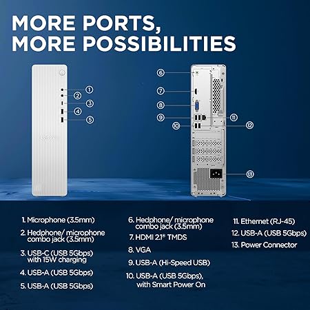 • Ports: Front Ports:- 1 x USB-C (USB 5Gbps / USB 3.2 Gen 1), with 15W charging | 2x USB-A (USB 5Gbps / USB 3.2 Gen 1) | 1x headphone / microphone combo jack (3.5mm) | 1x microphone (3.5mm) || Rear Ports:- 1 x USB-A (USB 5Gbps / USB 3.2 Gen 1), with Smart PowerOn | 1x USB-A (USB 5Gbps / USB 3.2 Gen 1) | 2x USB-A (Hi-Speed USB / USB 2.0) | 1x HDMI 2.1 TMDS | 1x VGA | 1x Ethernet (RJ-45) | 1x audio-out (3.5mm) |1x power connector