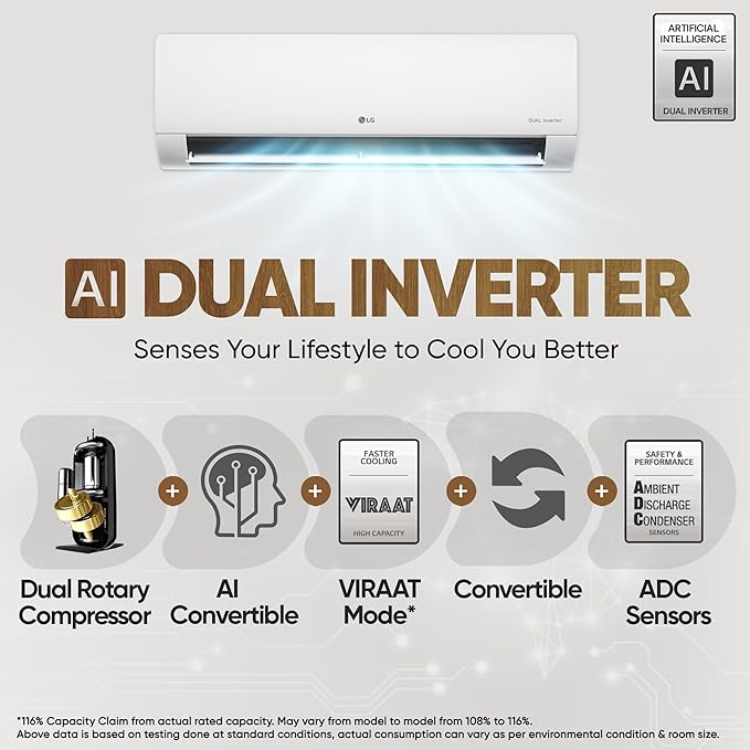 • LG Split AC with Dual inverter compressor: Experience powerful cooling with LG Split AC, featuring an energy-efficient inverter compressor for optimal performance and long-lasting durability.