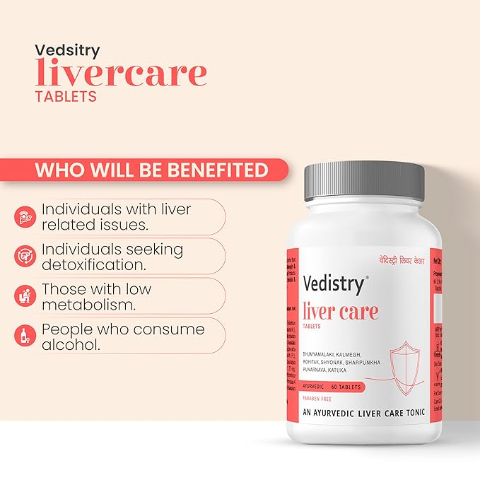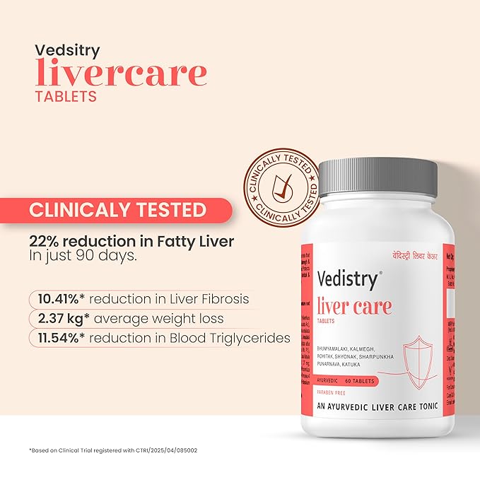 • CLINICALLY PROVEN AYURVEDIC SUPPORT FOR LIVER DETOX & REGENERATION:Vedistry Livercare Tablet is a clinically backed Ayurvedic supplement formulated with proven herbs like Bhumiamalaki, Kalmegh, Kutaki, and Amalaki to support liver detox, bile flow, metabolism, and regeneration. Supported by a clinical trial (CTRI/2025/02/080633), it shows a 22% reduction in fatty liver and a 10.41% reduction in liver fibrosis in 90 days, making it ideal for fatty liver, sluggish metabolism, or post alcohol/antibiotic liver support.