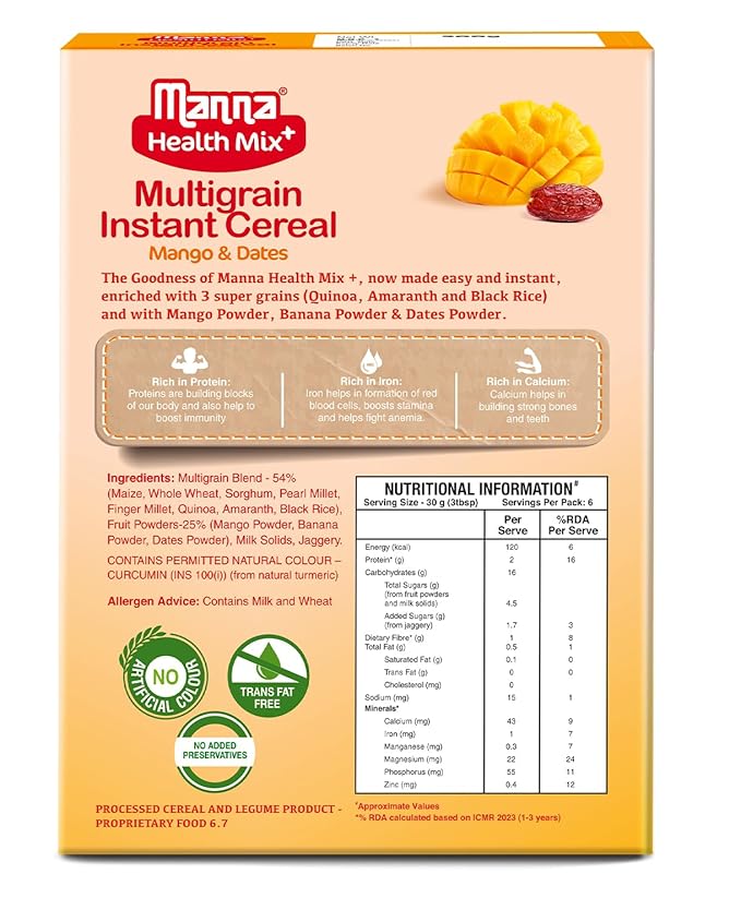 Manna Health Mix Instant Multigrain Cereal, Mango, Banana and Dates with Milk. Made with Real Fruits and 7 Supergrains and Millets. No Added Sugar, No Artificial Colour, Flavours 200g
