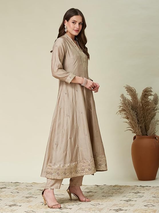 • Type of Fabric : Breathable Silk Blend Kurti Fabric, Inner Fabric : Crepe, Kurti Color : Grey, Print & Pattern : Embroidered, Pattern Type : Sequence, Dupatta Pattern : Lace with Embroidery, Dupatta Color : Violet, Kurta Style : Anarkali Kurti Set for Women, Neckline Style : V-Neck, Sleeve : 3/4 Sleeve, Length of Kurta : Knee Length, Bottom Type : Pant, Fit Type : Tailored, Relaxed and Readymade Fully Stitiched Anarkali Kurta Set, Department : Women