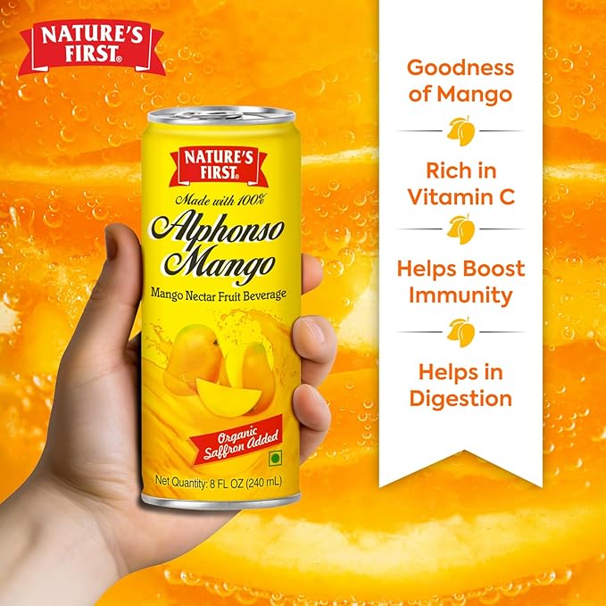 Nature First Alphonso Mango Juice (Pack of 6 x 240ml can) with Saffron, All Natural Fruit Drink, Source of Vitamin C, Rich in Fiber