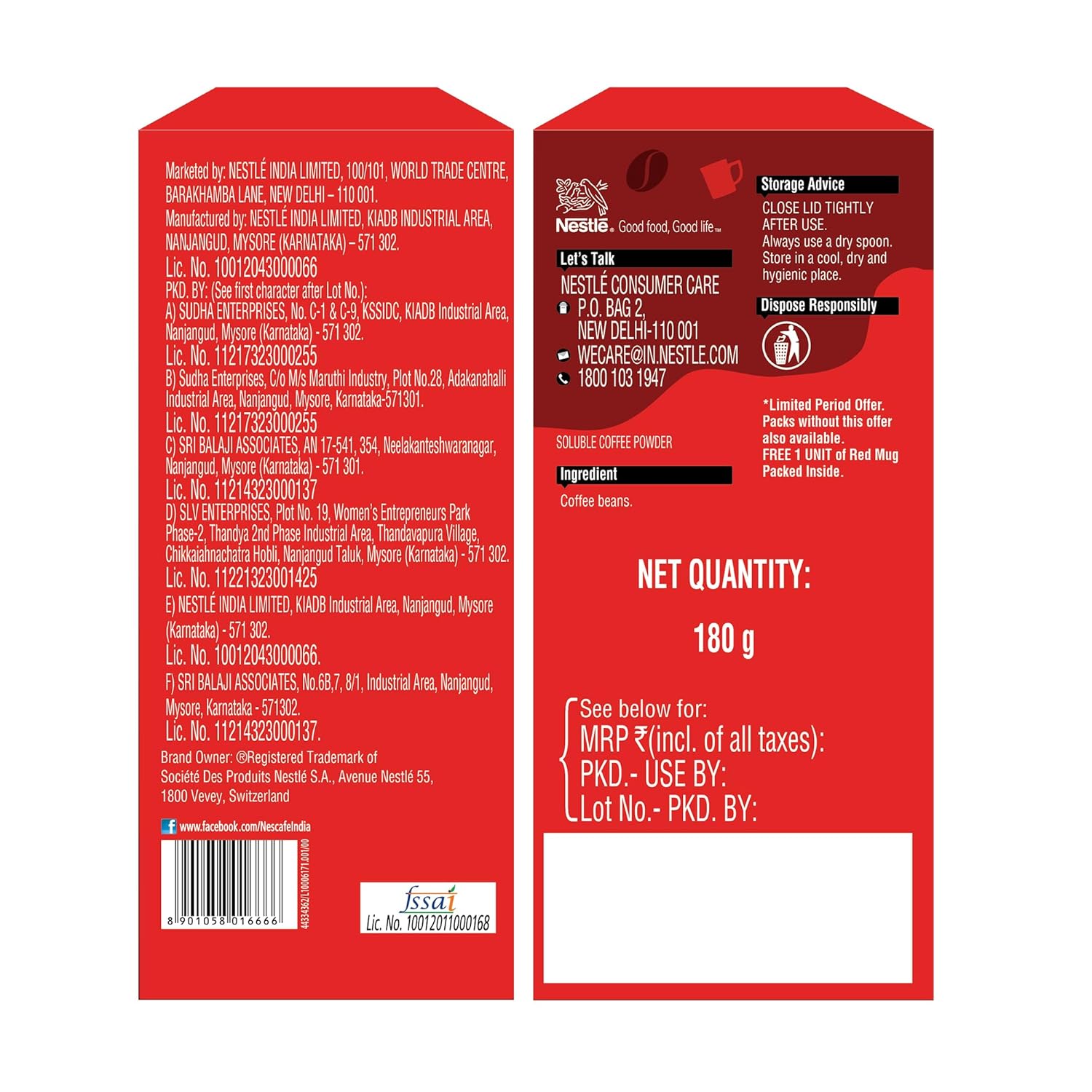Nescafe Classic Instant Coffee Powder | Great start to your morning | 100% Pure Coffee | Free Red Mug | 180g, Box
