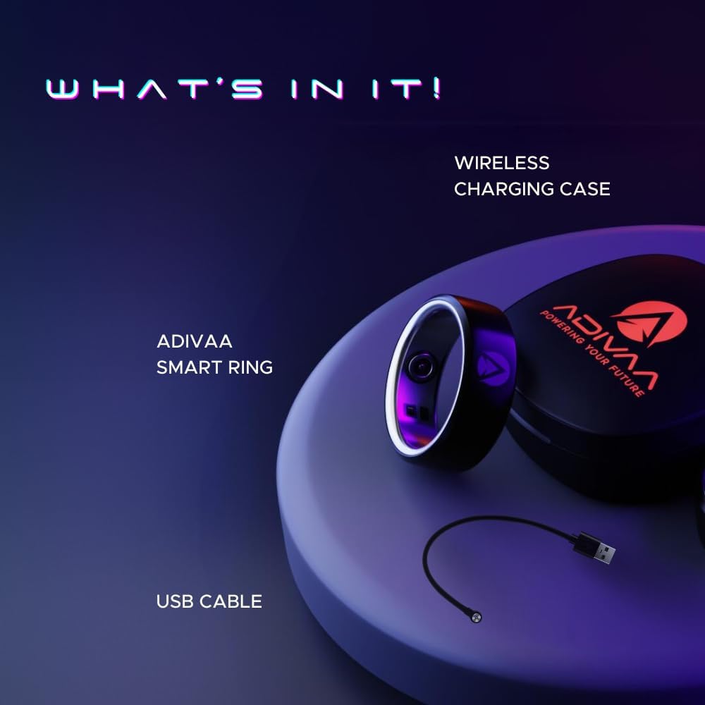 • [𝐒𝐏𝐄𝐂𝐈𝐅𝐈𝐂𝐀𝐓𝐈𝐎𝐍] : Introducing the R2 Smart Ring - Compatible with Android/iOS, Bluetooth 5.1, rapid charging (up to 60 mins), long-lasting battery life (up to 5 days), lightweight (5g), waterproof (IP68), available in silver and gold, crafted from zinc alloy and stainless steel, seamlessly integrates with the @Adivaa Ring@ App, with ample storage capacity (up to 30 days). Inside the box: 1 Ring, 1 Wireless Charging Case, 1 USB Ring Charger, 1 user manual.