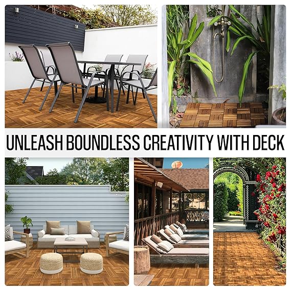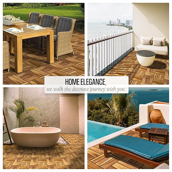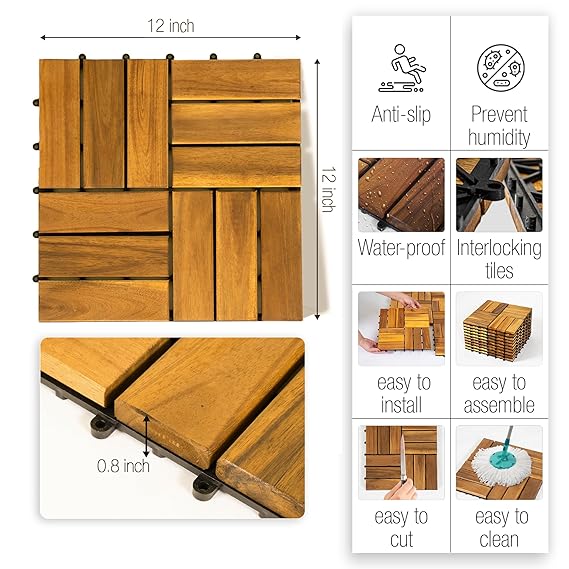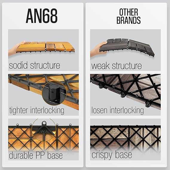 • PREMIUM NATURAL ACACIA WOOD: AN68 interlocking deck tiles are made from 100% natural acacia wood and PPC base, these decking tiles are engineered to withstand outdoor environments. Their smooth surface and elegant design add a refined touch to any space, while their sturdy construction ensures reliable performance.