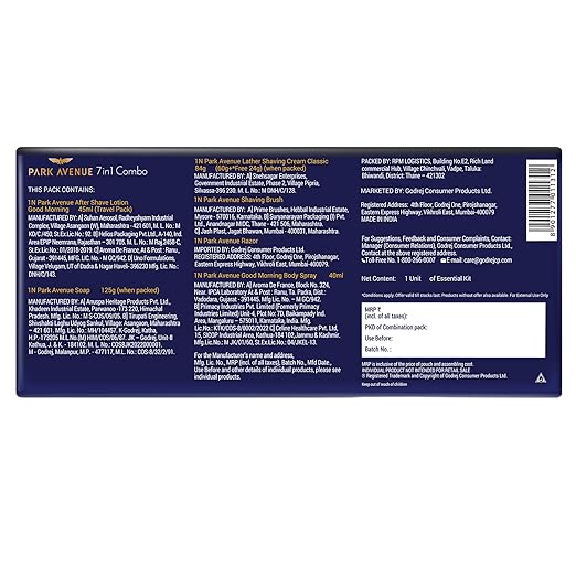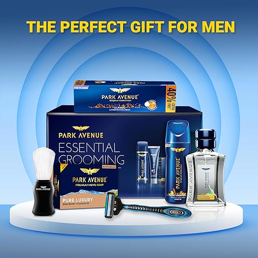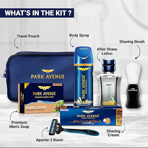 • CONTAINS: The Park Avenue Essential Grooming Collection Kit includes Park Avenue Good Morning After Shave Lotion for men (45ml), Park Avenue Premium Soap for Men's - Pure Luxury (125g), Park Avenue Classic Lather Shaving Cream for Men (84g), Park Avenue Shaving Brush for Men (1 unit), Apache Razor (1 unit), Free Travel Pouch inside