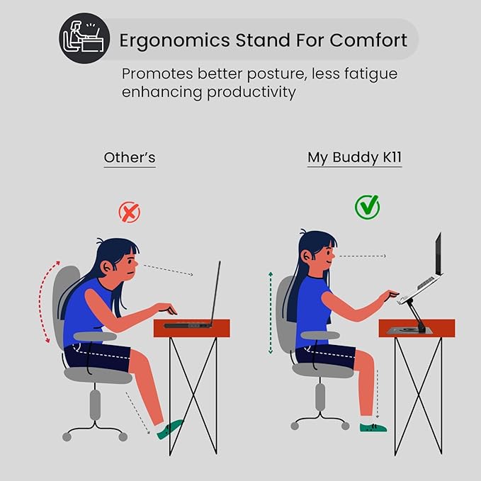• Foldable Laptop Stand: Portronics My Buddy K11 is a compact & foldable laptop stand, which makes it easy to carry for on-the-go productivity, whether it be at home, office, or while traveling.