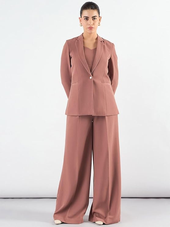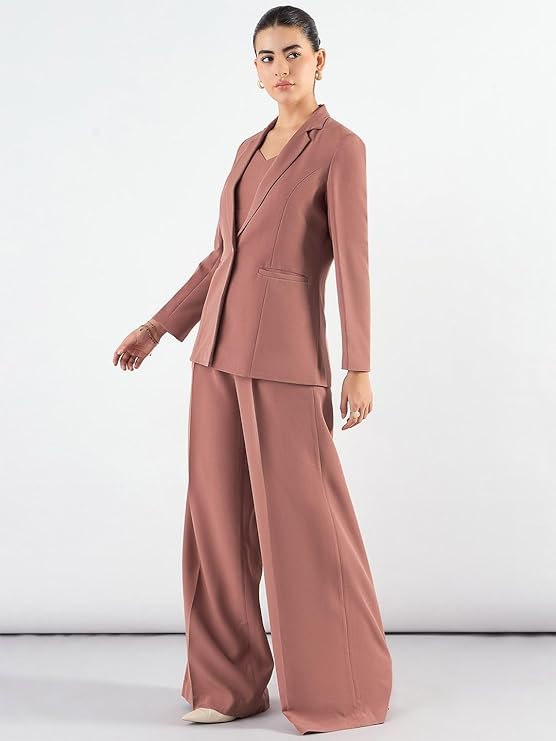 Powersutra Women’s Dusty Peach 3-Piece Formal Suit | Tailored-Fit Blazer, Waistcoat & Mid-Rise Trousers | Stretchable Fabric, Notched Lapel, Button Closure | Office & Business Wear