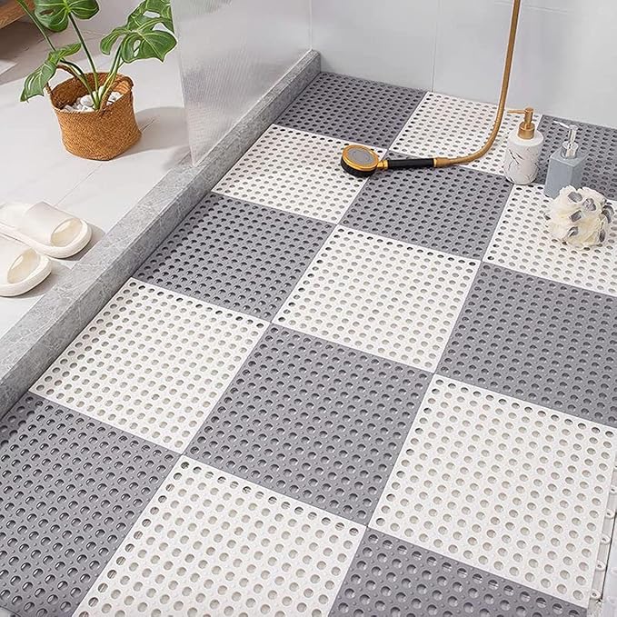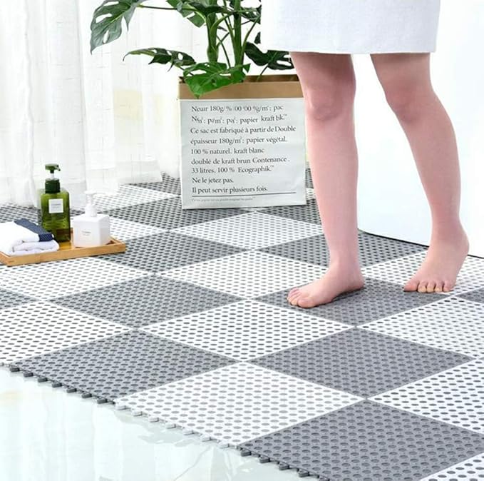 REDMART Interlocking Non-Slip Bathroom Floor Tiles with Drain Holes - Soft PVC Massage Bath Mats for Shower, Pool Deck, Patio & Garage - DIY Splicing Cushion Mat (Grey/White, Pack of [6])