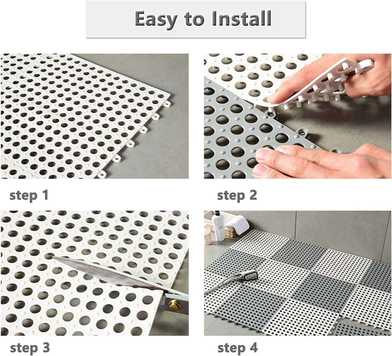 • EASY DIY INSTALLATION: No tools required! These modular tiles snap together easily by hand like a puzzle. You can customize the size or cut them with scissors to fit around toilets and corners perfectly.