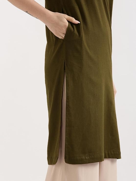 • Functional & Fashionable: Stay trendy while keeping your essentials close! This thoughtfully designed olive green kurta for women features two roomy side pockets, perfect for your phone, keys, or lipstick. Experience the perfect blend of style and convenience with our long kurti for women in every outfit.
