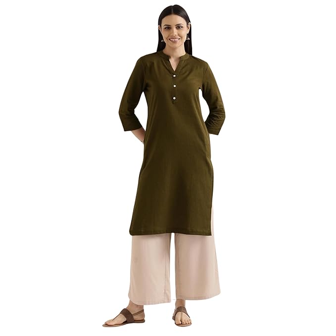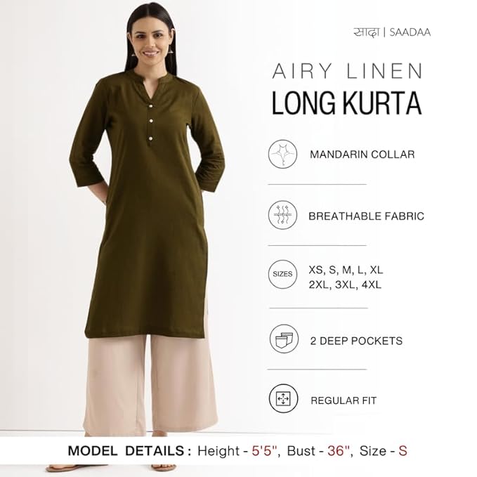 • Stylish Details: Elevate your wardrobe with this versatile linen kurtis for women featuring fashionable 3/4 sleeves & a sophisticated Mandarin neckline. Perfect for modern women, this effortlessly cotton kurtis seamlessly complements various bottom wear options. SAADAA long kurti for women can be paired with comfortable cotton pants for office, flowing palazzos for parties. Our cotton kurti promises endless styling possibilities while keeping you put-together throughout the day.