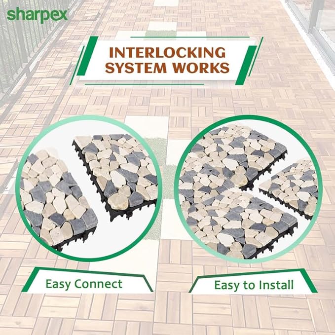 • Artificial Flooring: The Pebble deck tiles are made from pebble stones, which is sanded and oiled for a beautiful smooth appearance. These Stone deck tiles are compatible with any Sharpex deck tile, allowing you to create the design of your choice. Mix & match these wooden tiles with grass, stone, WPC tile for an elegant look. Deck Tile size approx. 12x12 inches.