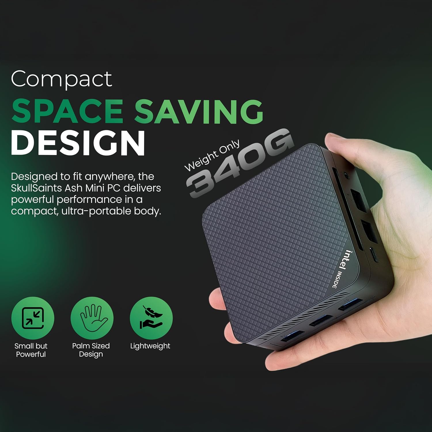 SKULLSAINTS Ash Mini PC – 13th Gen Twin Lake N150, 16GB LPDDR5, Triple Display (HDMI/DP), M.2 NVMe, WiFi 5, Bluetooth 5.2, USB 3.2, Ultra-Compact (13th Gen N150, 512, GB, Windows 11 Pro, 16, GB)