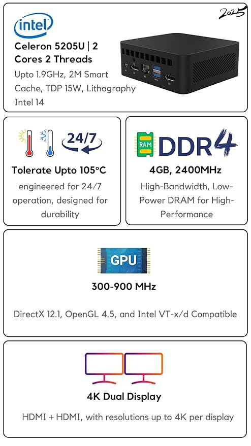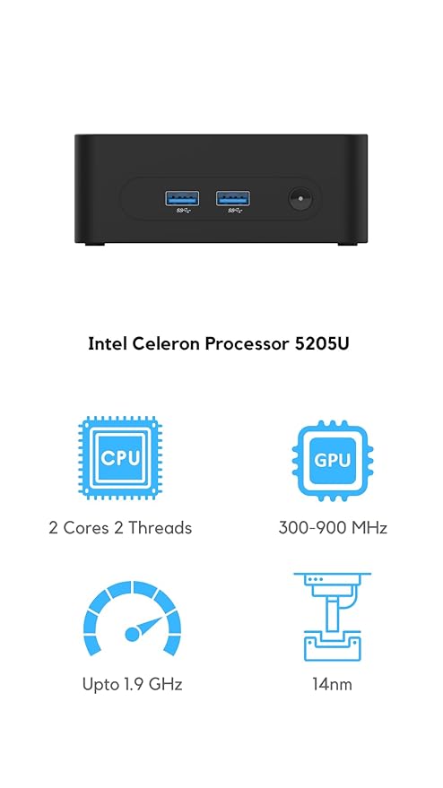 • ✅ Featuring a Celeron 5205U dual-core processor (1.9 GHz, 15 W TDP), ideal for everyday tasks with energy-efficient performance