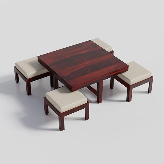 Solid Sheesham Wood Coffee Table with 4 Stool | Square Centre Table with Stool | Center Table with 4 Stools for Living Room | Patio Table with 4 Puffy for Home | Espresso Finish